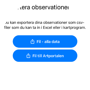 Du kan exportera dina mätningar som en csv-fil som du kan öppna i Excel eller i ett GIS-program.Du kan även exportera en fil som är anpassad för att enkelt klistra in i Artdatabankens excelrapportering.Tyvärr har Artdatabanken slutat låta utvecklare använda deras Api för att rapportera arter. Vi hoppas att de ska ändra sig i framtiden och låta oss rapportera arter från appen.